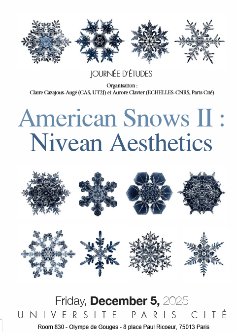 Second volet d’un cycle de deux journées d’études, cette JE « American Snows : Nivean Aesthetics », co-organisé par Aurore Clavier (U. Paris Cité) et Claire Cazajous-Augé (U. Toulouse Jean Jaurès), se placera à la croisée entre écocritique, histoire culturelle et études environnementales, afin de proposer une entrée novatrice dans les recherches menées sur l’eau et ses différentes formes. En réunissant l’artiste Shelley Jackson, dont la conférence plénière portera sur son projet Snow (texte littéralement composé dans la neige) et différents spécialistes en littérature, arts visuels et histoire environnementale, ces réflexions nourriront le dialogue interdisciplinaire entre les travaux menés en sciences de la vie et de la terre – Projet « Ice Memory » à l’IGE de Grenoble, « Project Snowfall » à Strathclyde University – et dans le champ des Blue Humanities et Ice Humanities – à l’image des projets « Eaux, Ville et Santé » et « Polar X » impliquant des chercheurs d’ECHELLES.